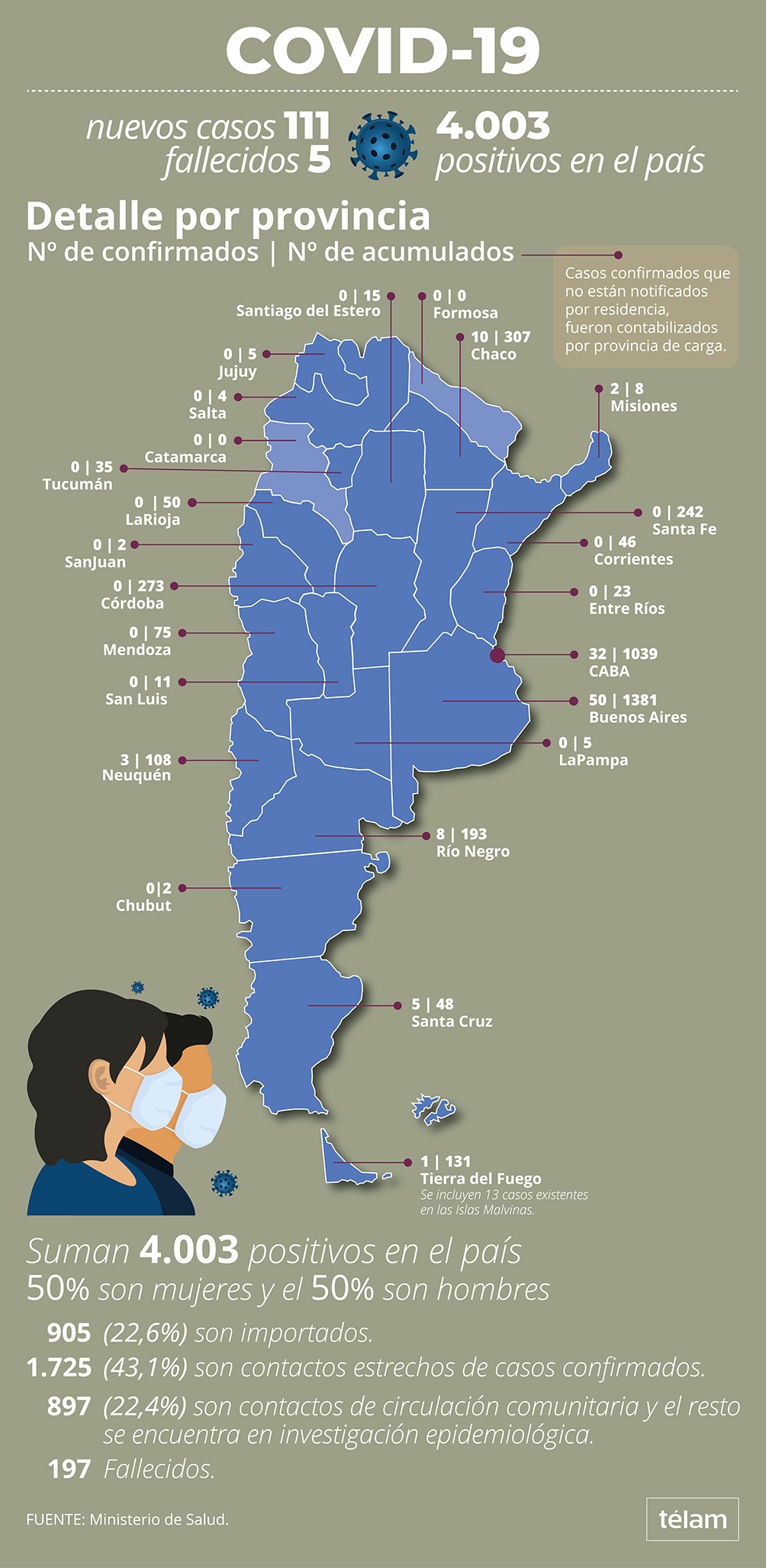Estas recomendaciones se dan en un contexto de 4003 casos reportados a nivel nacional (con 197 fallecidos), 1.381 en la provincia de Buenos Aires, 1.039 en la Ciudad y 307 en Chaco.