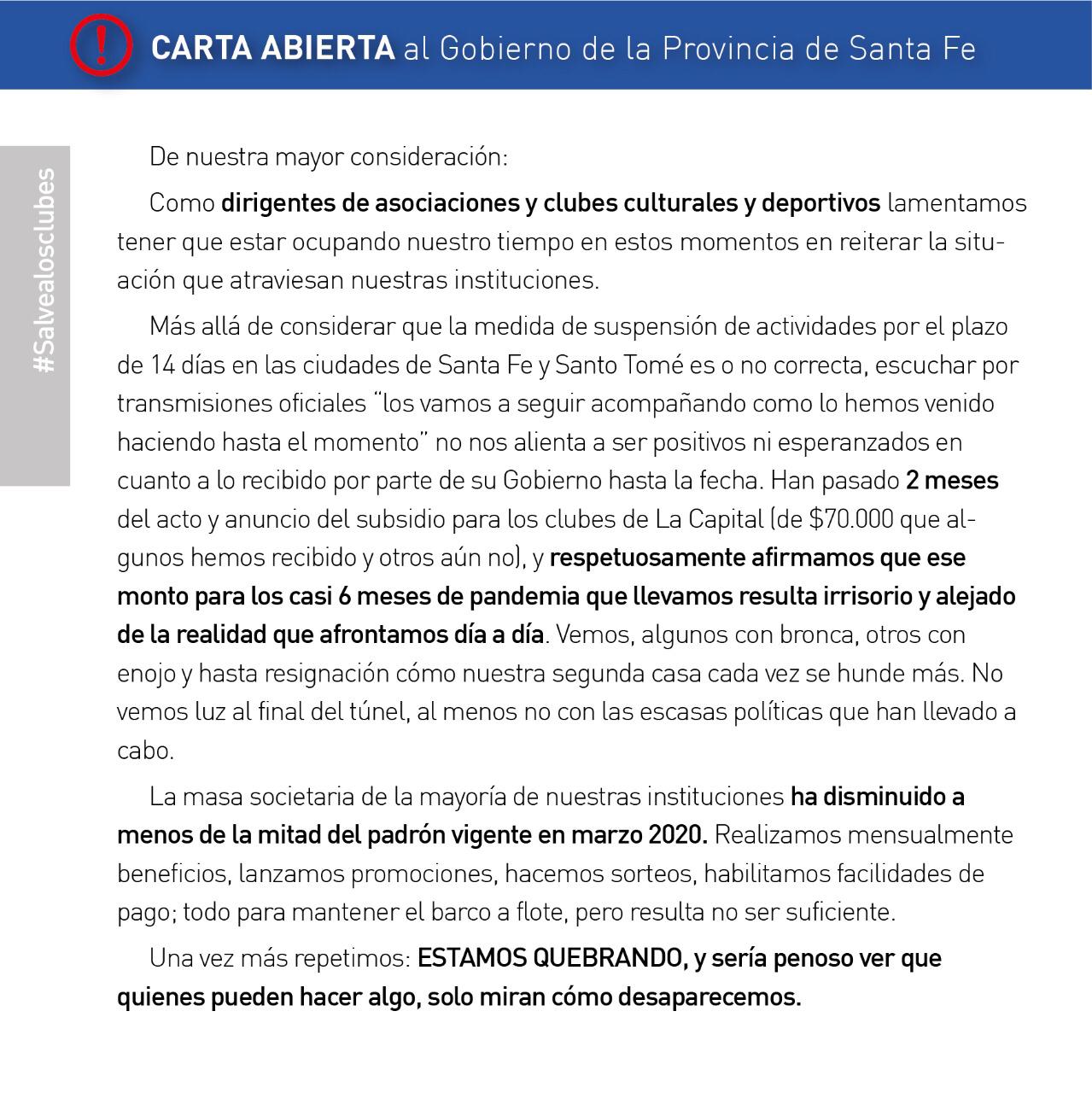 Luego, recuerdan que “han pasado dos meses del acto y anuncio del subsidio para los clubes de La Capital (de $70.000 que algunos hemos recibido y otros aún no), y respetuosamente afirmamos que ese monto para los casi 6 meses de pandemia que llevamos resulta irrisorio y alejado de la realidad que afrontamos día a día”.