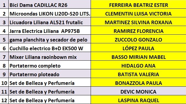 Los premios sorteados fueron: 1° una Bici de dama; 2° un horno microondas; 3° una licuadora; 4° una jarra eléctrica; 5° una planchita y secador de pelo; 6° un cuchillo eléctrico; 7° un mixer; 8° y 9° un portatermo completo y 10°, 11° y 12° un set de belleza y perfumería.