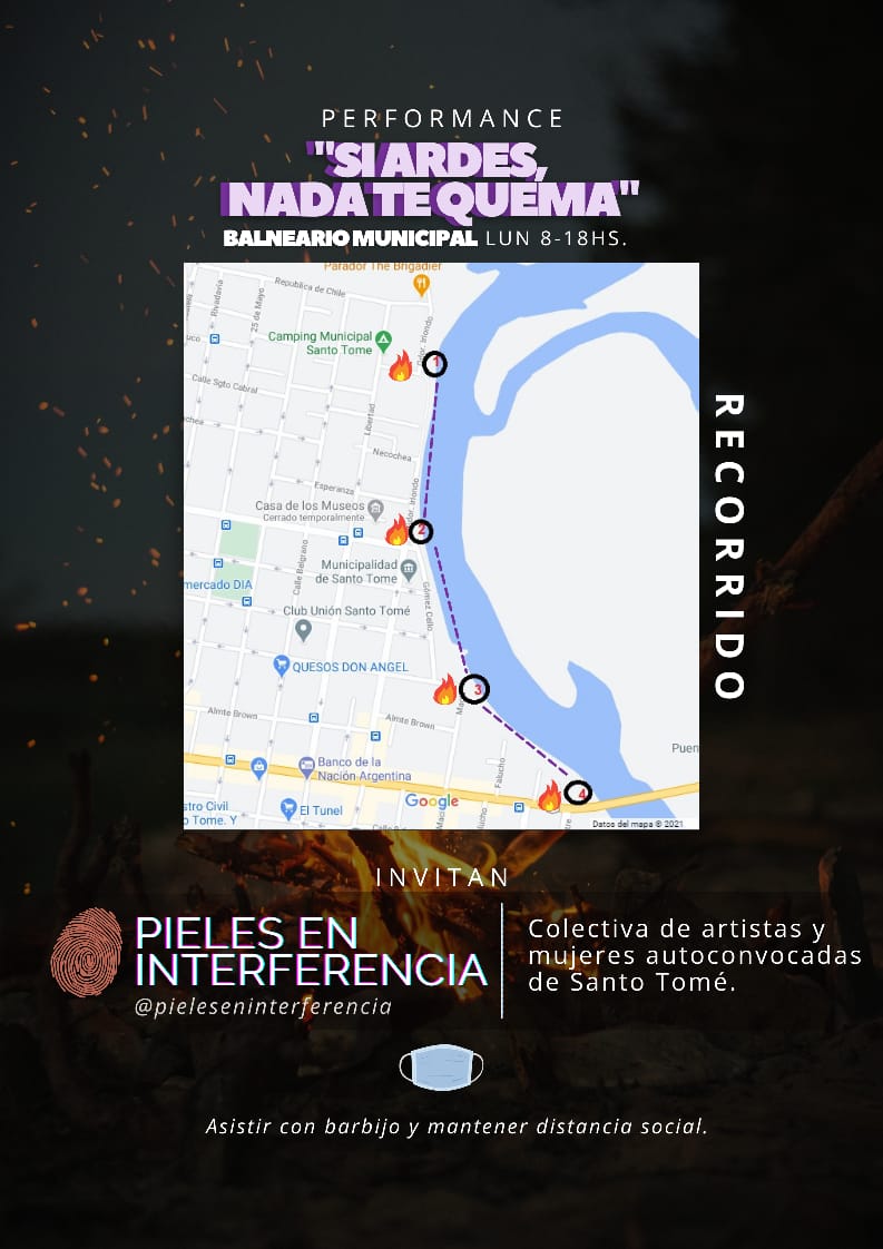 En el marco del 8M la Colectiva de artistas y mujeres autoconvocadas de nuestra ciudad, "Pieles en Interferencia" llevará a cabo este lunes -a partir de las 18 horas en el Balneario Municipal- una performance en la vía pública titulada "Si ardes nada te quema".