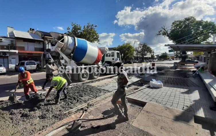 Con el armado de una plataforma de hormigón, este lunes avanzaron los trabajos de reparación del pavimento frente al parador de colectivos de media y larga distancia ubicado sobre la avenida 7 de Marzo.