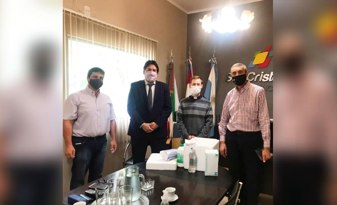 El titular del F.I.D.R también se reunió con el diácono Alexis Pardo y el párroco Lucas Pesot. Durante el encuentro, les donó insumos médicos, de higiene y protección sanitaria.