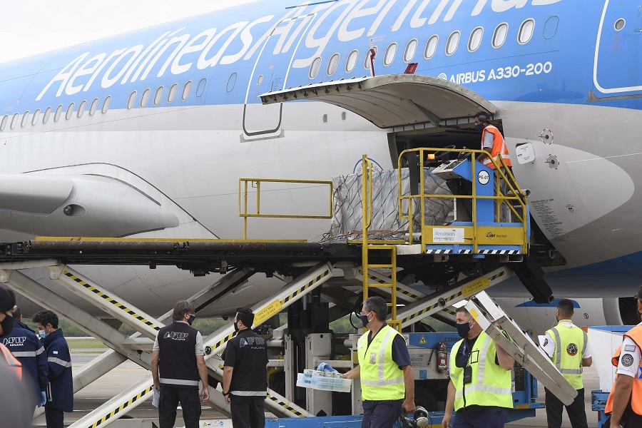 La tercera partida de vacunas Sputnik V llegó al país en un vuelo de Aerolíneas Argentinas