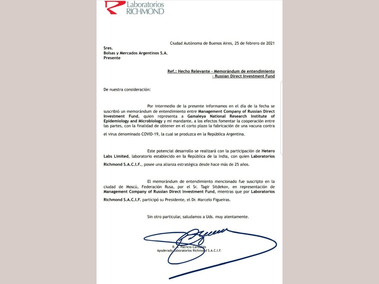 El laboratorio Richmond de la Argentina firmó un memorándum de entendimiento con la Sociedad Gestora del Fondo Ruso de Inversión Directa (RDIF), para producir la vacuna Sputnik V contra el coronavirus en el país, según informó la empresa.