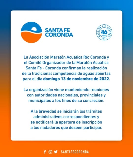 A través de un comunicado oficial, la Asociación Maratón Acuática Río Coronda y el Comité Organizador de la Maratón Acuática Santa Fe - Coronda confirmaron que el próximo 13 de noviembre se realizará la tradicional competencia de aguas abiertas.