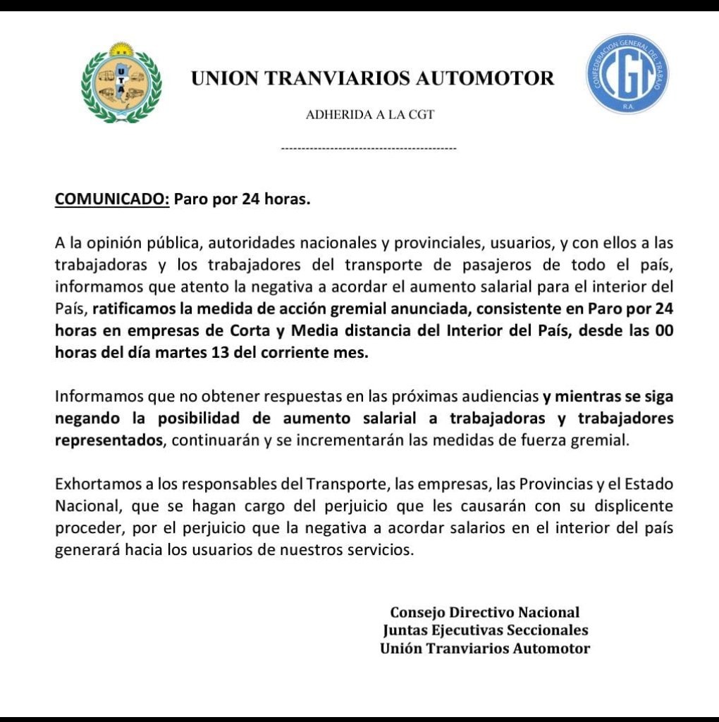 Tras la reunión entre los empresarios del totransporte público de pasajeros y representantes de la Unión Tranviarios Automotor (UTA) sin acuerdo y al vencerse esta medianoche el plazo de la conciliación obligatoria que había sido dictada por el Ministerio de Trabajo, quedó confirmado el paro de actividades de 24 horas para este martes en los servicios de colectivos de corta y media distancia de todo el país.