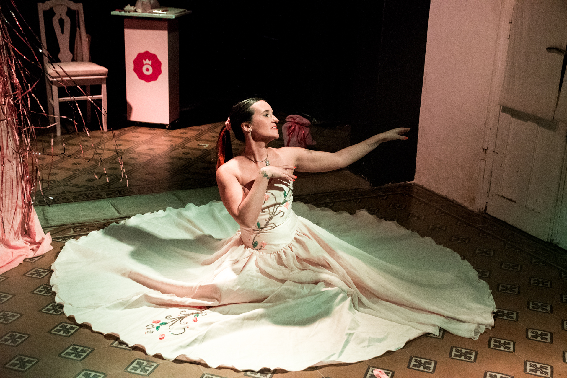 En escena Antonela/Rosa Fondant, en el doble ritual del teatro y de los 15, “venderá” a les presentes con su marketing de pacotilla una fiesta quinceañera piramidal para festejar en cualquier momento de la vida. La palabra fondant tiene su origen en el idioma francés y es utilizada para expresar o definir algo que se funde. Posteriormente fue adaptada al inglés para denominar la masa elástica y comestible que hoy conocemos, un recubrimiento para tapar imperfecciones. Esta plastilina es nuestra metáfora para una bella durmiente que despierta, alfiler de por medio, a una realidad donde no hay fiesta.