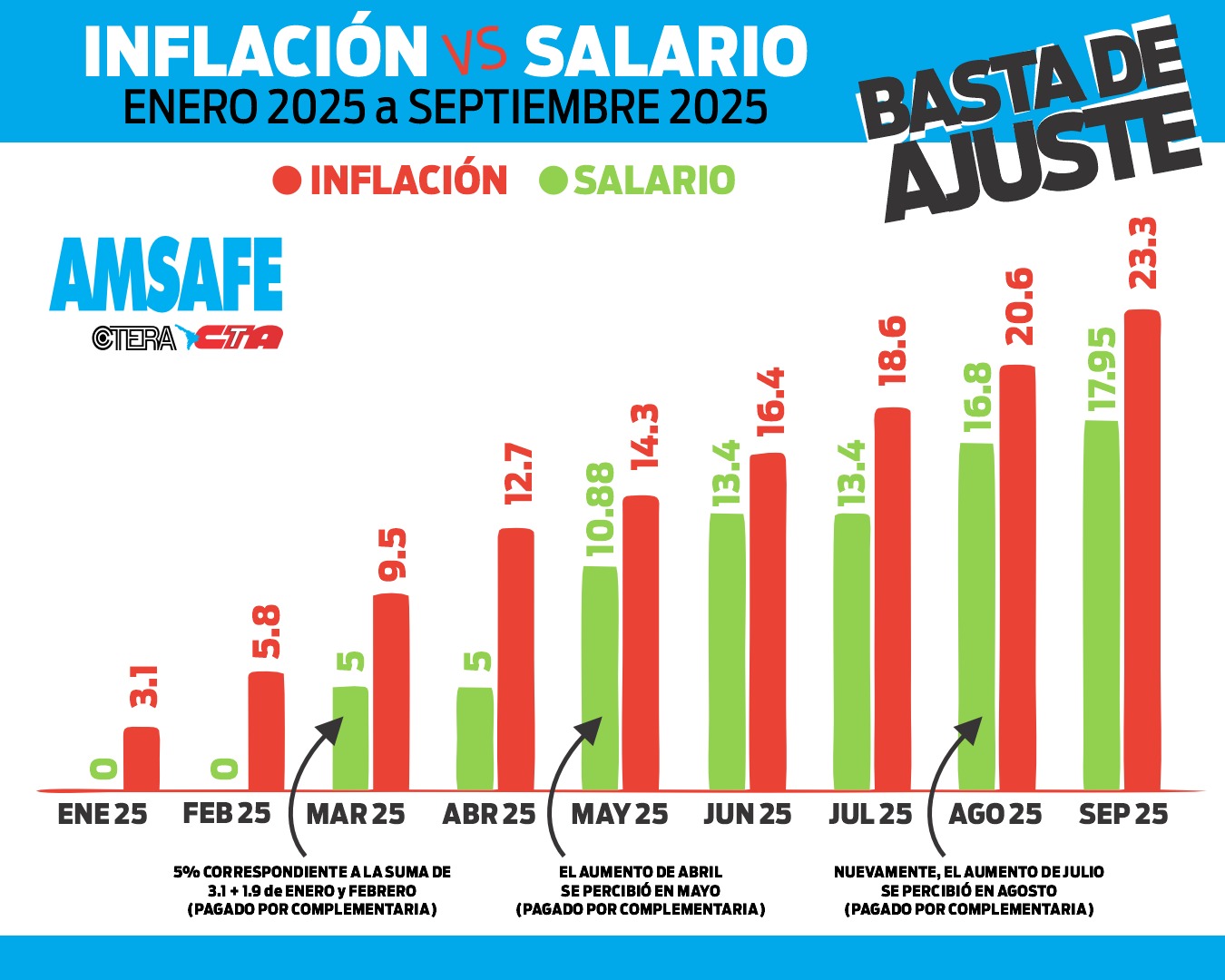 “Basta de ajuste”, fue la consigna que acompañó la publicación, que incluyó comparaciones mes a mes entre la evolución de los precios y los incrementos otorgados al sector. Según el análisis, la caída del salario real fue del 23,27 % en 2024 y del 5,35 % en lo que va del 2025.