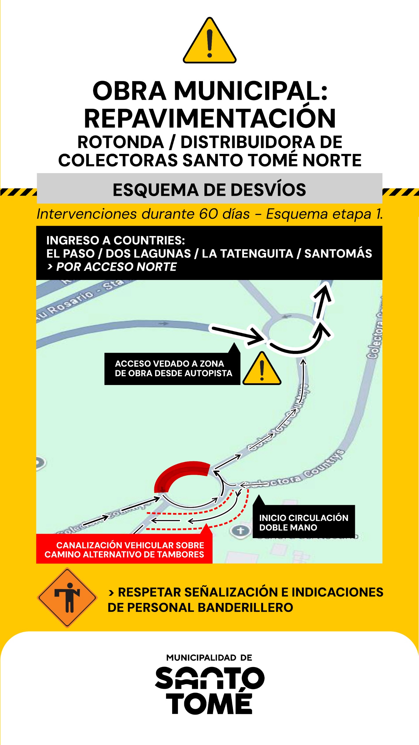 La Municipalidad de Santo Tomé informó que se encuentra en ejecución la obra municipal de repavimentación de la rotonda y distribuidora de colectoras en Santo Tomé Norte. Los trabajos se extenderán por un plazo estimado de 60 días y demandarán la implementación de una serie de desvíos y modificaciones y temporales en la circulación vehicular.
