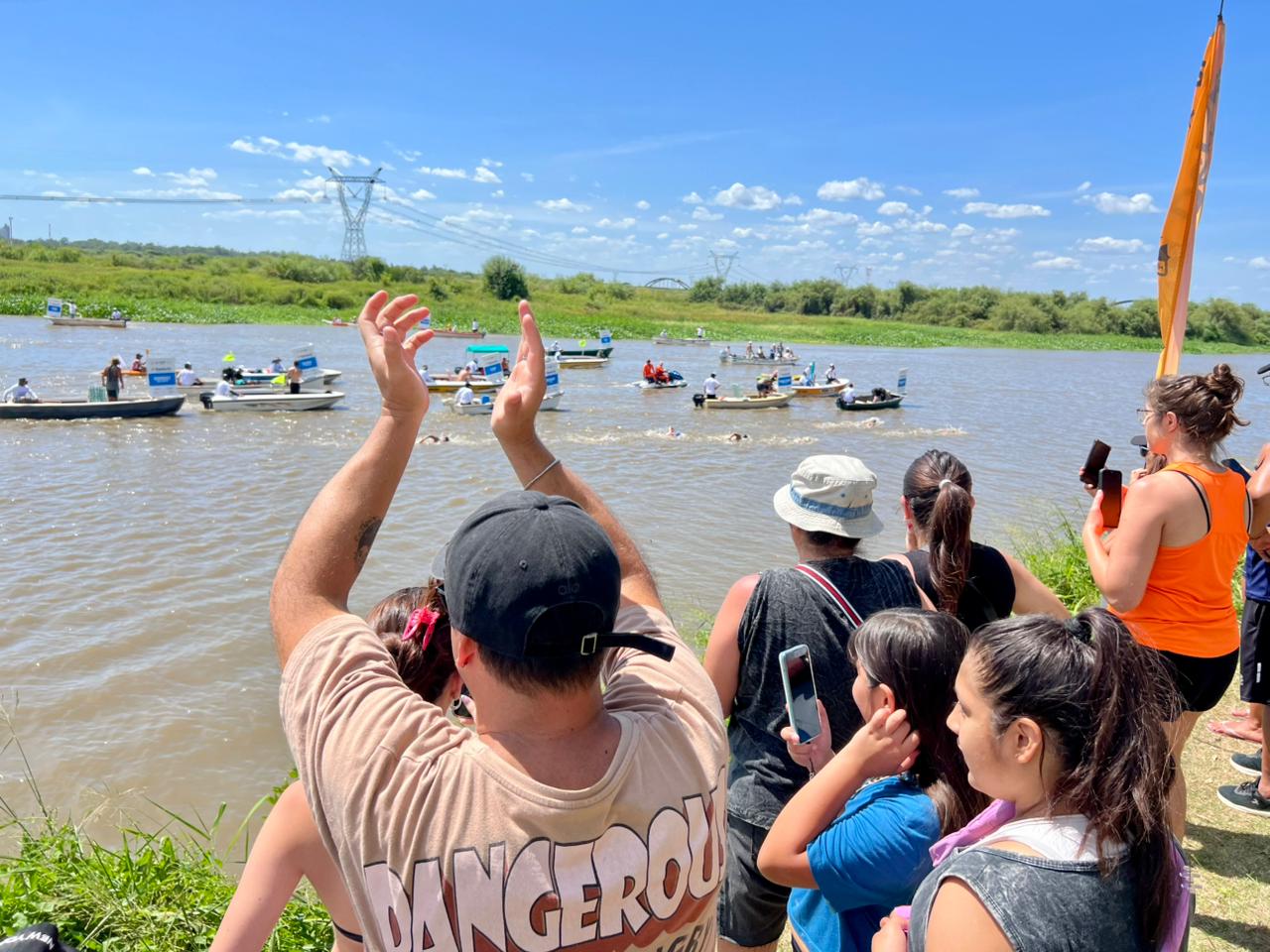 El cruce por el Puente Carretero fue uno de los momentos más celebrados, cuando las embarcaciones que acompañaban la competencia hicieron sonar bocinas y sirenas, y desde la costa los aplausos bajaban como un abrazo para quienes venían braceando desde la Laguna Setúbal.